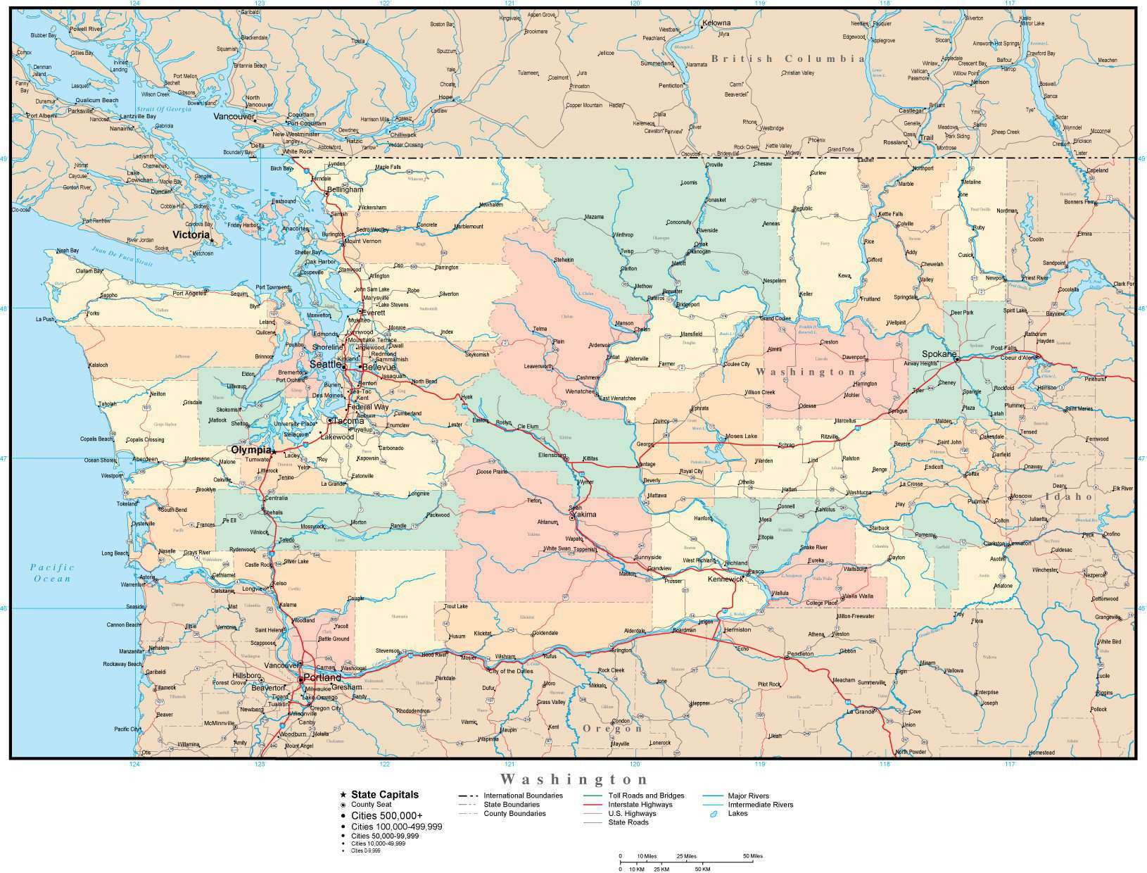 Washington Digital Vector Map with Counties, Major Cities, Roads